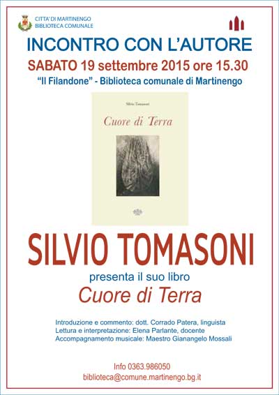 Il 19 settembre Silvio Tomasoni presenta il suo libro, "Cuore di Terra", al pubblico del Filandone, la biblioteca comunale di Martinengo, suo paese natale, centro culturale che già in passato ha ospitato alcune sue mostre ("Nebbia, mostri e metamorfosi", 24/01/2015).